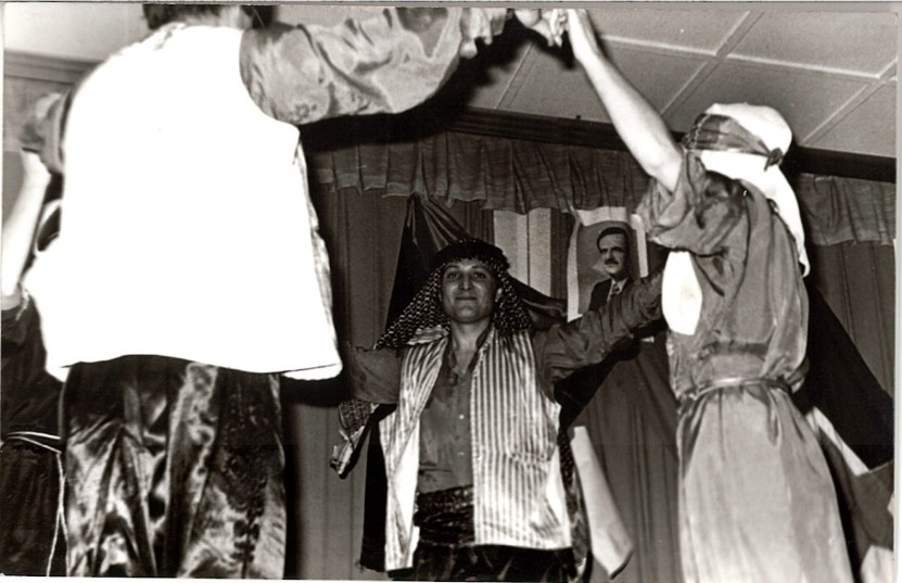 Fotografija g. Hichama Naoula u narodnoj nošnji s kolegama, snimljena na pozornici Studentskog centra u Zagrebu tijekom izvedbe tradicionalnog plesa "Dabke". Ples je bio dio programa obilježavanja Dana dolaska stranke Baas (Al-Baath) na vlast u Siriji.