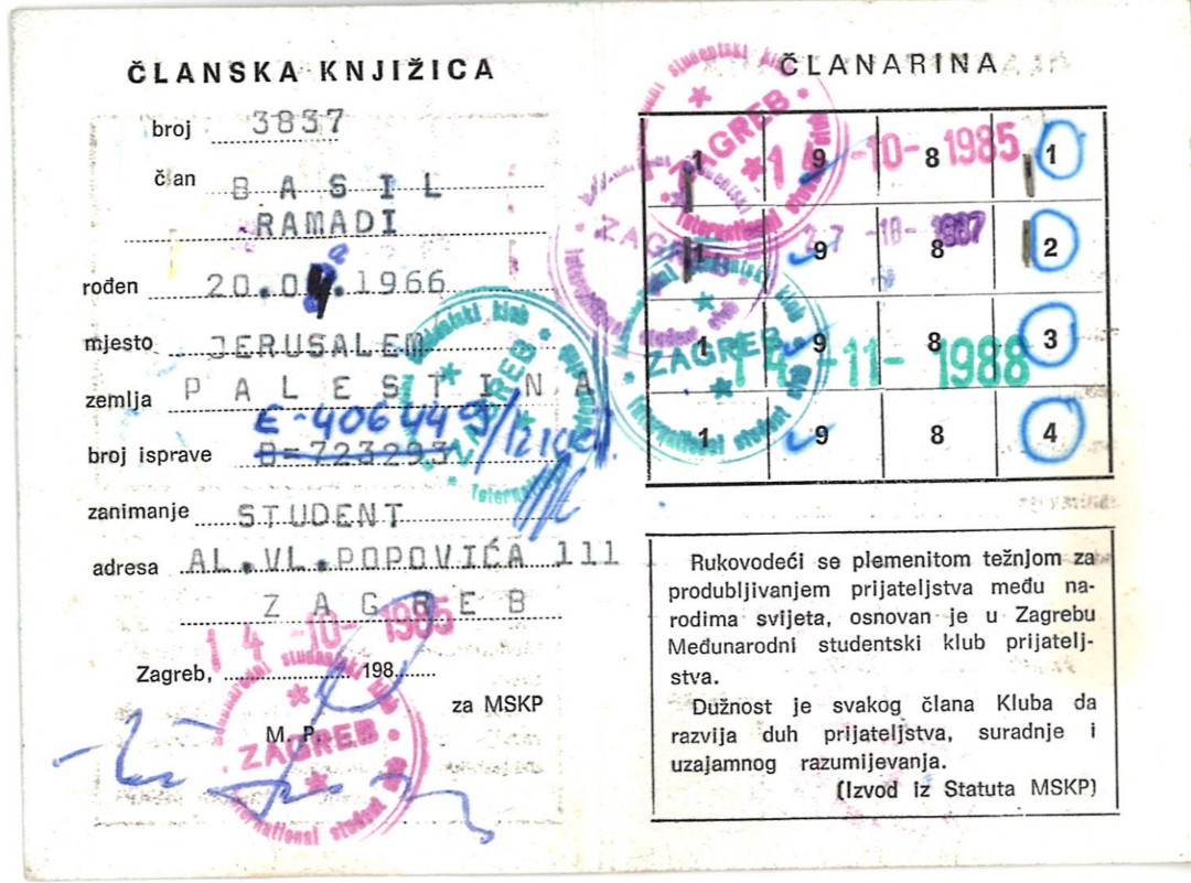 Članska knjižica MSKP-a Zagreb g. Basela Ramadija, rođenog u Jeruzalemu, Palestina. U Zagreb je stigao 1985. godine i upisao studij na Stomatološkom fakultetu. Knjižica sadrži fotografiju člana te natpise "Međunarodni studentski klub prijateljstva" na hrvatskom, engleskom, ruskom, francuskom, španjolskom i rukom pisanom arapskom jeziku. Broj knjižice g. Ramadija je 3837. U rubrici "zanimanje" navedeno je da je student.