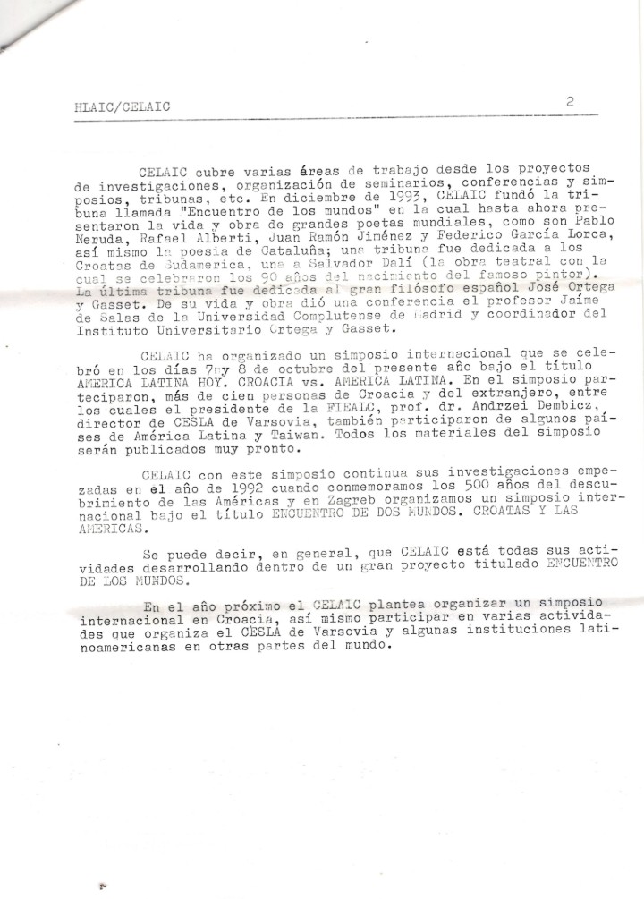 HLAIC/CELAIC; HRVATSKI LATINSKOAMERIČKI I IBERSKI CENTAR; CENTRO LATINOAMERICANO E IBERICO DE CROACIA; U tekstu se opisuje na španjolskom jeziku ciljevi i rad spomenute neprofitne organizacije.