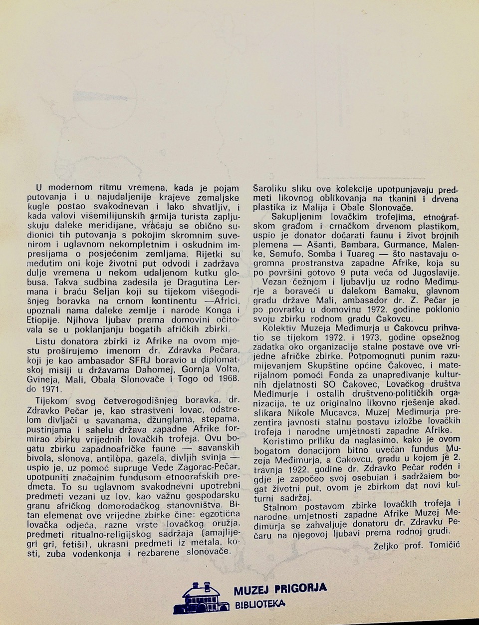 Katalog izložbe o Zdravku Pečaru "Lovačka zbirka dr. Zdravka Pečara". Muzej Međimurja izradio u suradnji s Muzejem afričke umetnosti u Beogradu.