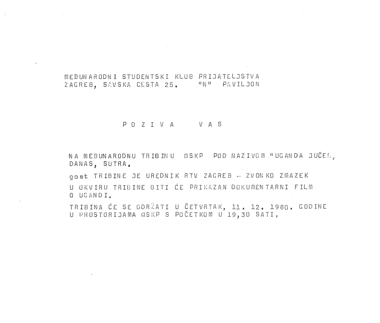 Časopis Solidarnost izdaje Međunarodni studentski klub prijateljstva, počinje izlaziti 1966. godine. Unutar časopisa nalazi se pozivnica na međunarodnu tribinu MSKP pod nazivom "Uganda jučer, danas, sutra.".