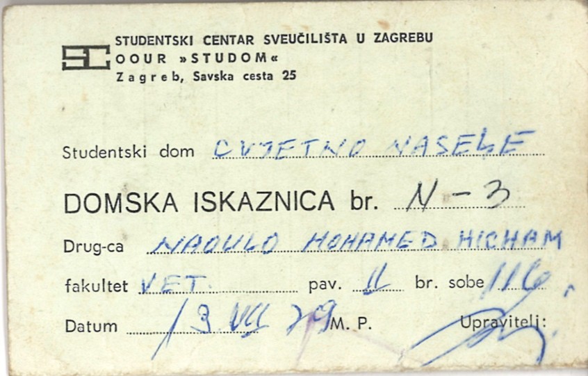 Domska iskaznica, broj 3, g. Hichama Naoula, izdana u Beogradu za studentski dom u Cvjetnom naselju u Zagrebu. Iskaznica je izdana 13. srpnja 1979. za II. paviljon.