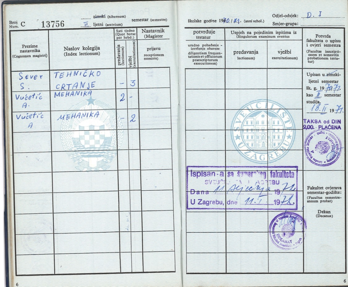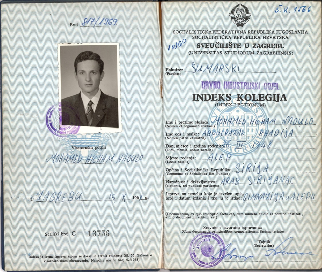 Indeks g. Hichama Naoula za preddiplomski studij na Šumarskom fakultetu Sveučilišta u Zagrebu za akademsku godinu 1969./1970., s upisanim kolegijima, potpisima profesora i potvrdom o obavljenom liječničkom pregledu. Akademsku godinu 1970./1971. ponavljao je, a iz pečata je vidljivo da se 11. siječnja 1972. ispisao s fakulteta.