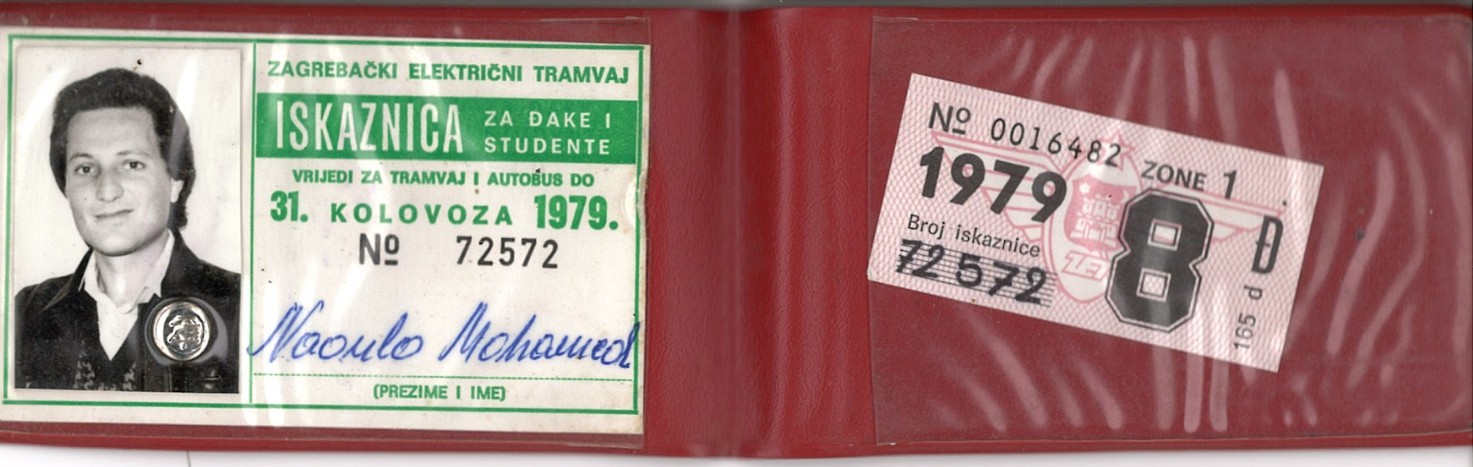 Crveni ZET (Zagrebački električni tramvaj) pokaz koji je pripadao g. Hichamu Naoulu. Ova godišnja ZET-ova iskaznica za đake i studente vrijedila je do 31. kolovoza 1979. godine. Njen serijski broj je 72572. Iskaznicom se moglo voziti tramvajima i autobusima u Zagrebu godinu dana uz mjesečnu kupnju markice koja se morala umetati u etui uz iskaznicu kako bi se potvrdilo da je mjesečna markica plaćena i valjana. Prikazana je markica za zonu 1, serijskog broja 0016482, za kolovoz 1979. godinu.