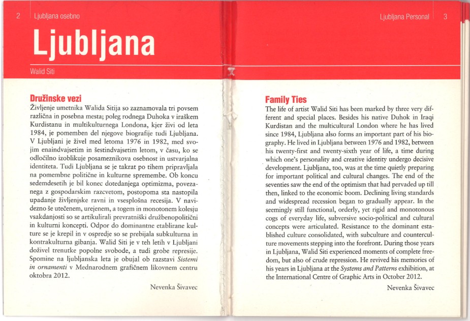 Alternativni vodič "Ljubljana osobno". Iz predgovora Nevenka Šivavec: "Život umjetnika Walida Sitija obilježen je trima vrlo različitim i posebnim mjestima. Osim njegovog rodnog Duhoka u Iračkom Kurdistanu i multikulturalnog Londona u kojem živi od 1984. godine, važan dio njegove biografije čini i Ljubljana. U Ljubljani je živo između 1976. i 1982. godine, razdoblje u kojem osobnost i kreativni identitet prolaze kroz odlučujući razvoj. Ljubljana se u to vrijeme također tiho pripremala za političke i kulturne promjene.
