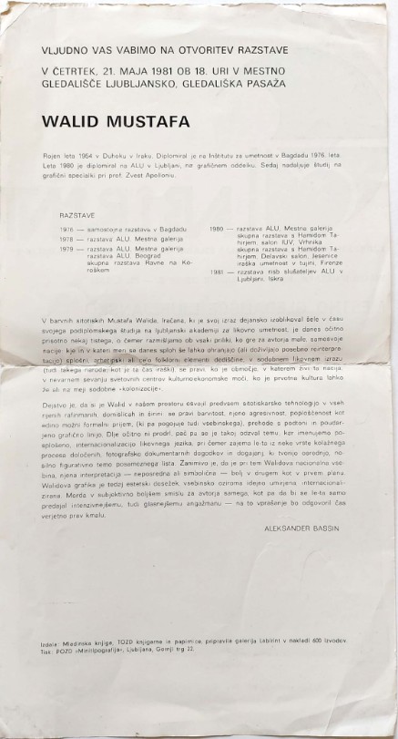 Letak za izložbu grafika Walida Mustafa, Ljubljana prodajna Galerija mladinske knjige, Trg revolucije 2.